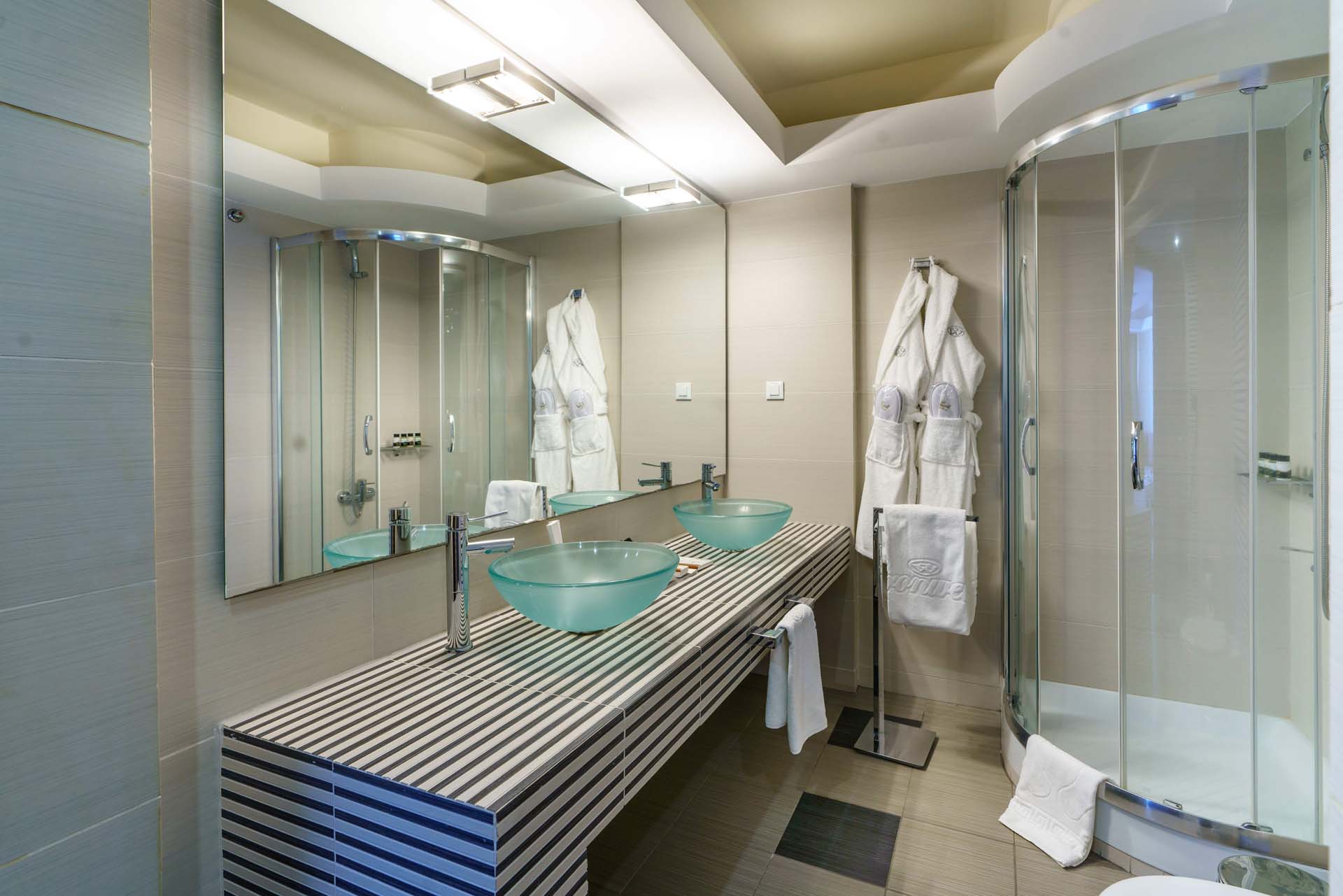Two‑room Suites are located in the main building and offer beautiful side sea or mountain views, combining a comfortable double bed and double sofa‑bed to create an inviting space for relaxed family or friends’ stays.